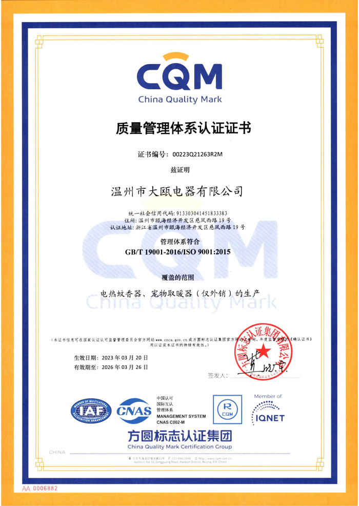 秉承“以人為本,以質(zhì)取勝”的經(jīng)營理念,三十余載櫛風沐雨,踐行“成就客戶、價值為本、誠信務實、追求卓越”的核心價值觀。大甌公司堅持以產(chǎn)研一體化的經(jīng)營模式與差異化的競爭戰(zhàn)略為基點,持續(xù)推出細分市場上的多種類產(chǎn)品,豐富產(chǎn)品矩陣,滿足消費者多樣化需求,助力新型驅(qū)蚊行業(yè)高速發(fā)展。